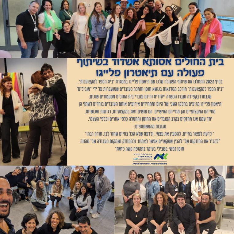 החל מיולי 2023 ועד היום תיאטרון פלייגו משתתף בפרוייקט ייחודי של אסותא אשדוד – פרויקט ארוך טווח הממוקד בתכנים הקשורים לחמלה וחוסן במגזר הרפואי. במסגרת ימי העיון מטעם ביה"ס למקצוענות של אסותא אנו פוגשים קבוצות קטנות של עובדים.ות ומקשיבים לסיפוריהם, המתכתבים עם התכנים של הסמינר. במקרים רבים משתפים אותנו בהתמודדות של הצוותים עם מכלול האירועים שהתרחשו החל ממתקפת הטרור ב- 7.10 דרך קבלת הפצועים במלחמה, כמו גם סיפורים רבים ומגוונים מהרגעים ההזויים, המאתגרים והכואבים לצד הרגעים הייחודים והמוצלחים של שגרת בית החולים.