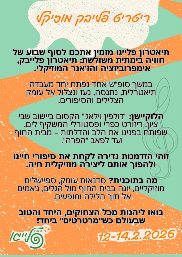 תיאטרון פלייגו מרכז לאמנויות הפלייבק והאימפרוביזציה שמח להזמין אתכםן לריטריט פלייבק מוזיקלי בדולפין וילאג' הקסום בשבי ציון